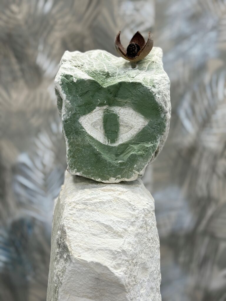 La primera instalación, describe la galería, examina la tiza como un material significativo para la identidad británica. La politización de la costa inglesa transformó sus acantilados en fronteras imponentes, tanto física como simbólicamente. Sin embargo, la tiza también funciona como un registro visual del “tiempo profundo”, formada por restos acumulados de organismos microscópicos durante millones de años, cuando las islas británicas estaban conectadas a grandes masas de tierra y las fronteras no existían. En sala se podrán apreciar instalaciones escultóricas hechas con tiza del Parque Natural Chafford Gorges, y que fueron pintadas, grabadas y fusionadas con plantas secas (aludiendo a la dispersión botánica global durante el colonialismo). En las paredes del espacio, Pizzani imprimió sus extremidades, su cabeza y sus manos sobre el yeso húmedo en un acto performático solitario, para evocar figuras de fósiles que revelan el comportamiento de organismos antiguos.