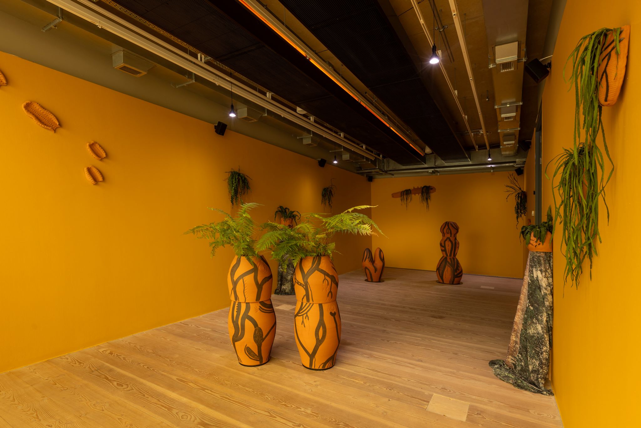 Adicionalmente, la artista presenta cerámicas que interactúan con pinturas de gran formato de Jaime Gili, que forman un mural visible desde la plaza exterior de la galería. Esta obra referencia el mapa geológico de William Smith de 1815, que denota una visión fundacional pero extractivista del paisaje británico.